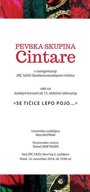 V Atriju ZRC gostimo koncert z naslovom "Se tičice lepo pojo..." na katerem se bo predstavila pevska skupina Cintare. Pevke ljudskih pesmi, ki prihajajo iz Ljubljane, praznujejo petnajsto obletnico svojega delovanja. Vljudno vabljeni, da z njimi in njihovimi gosti preživite lep kulturni večer.