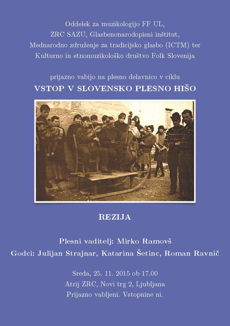 Vabljeni na Vstop v slovensko plesno hišo, ki bo v sredo, 25. 11. ob 17h v Atriju ZRC. Na plesni delavnici se bomo učili rezijanske plese. Plesni vaditelj bo Mirko Ramovš, godci pa Julijan Strajnar, Katrina Šetinc in Roman Ravnič. Dogodek organiziramo skupaj z Oddelkom za muzikologijo FF UL, Mednarodnim združenjem za tradicijsko glasbo (ICTM) ter Kulturnim in etnomuzikološkim društvom Folk Slovenija. Vstopnine ni.